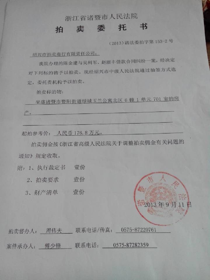 受諸暨市人民法院委托,定于2013年10月10日上午10:00在諸暨市公共資源交易中心交易大廳公開(kāi)拍賣(mài):